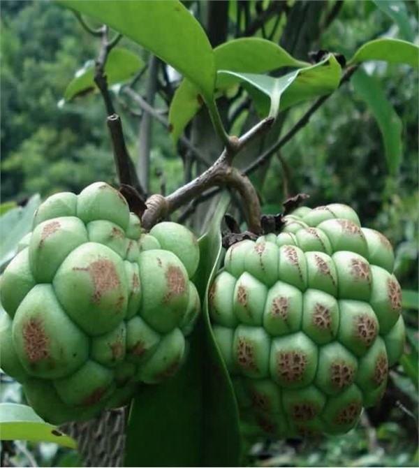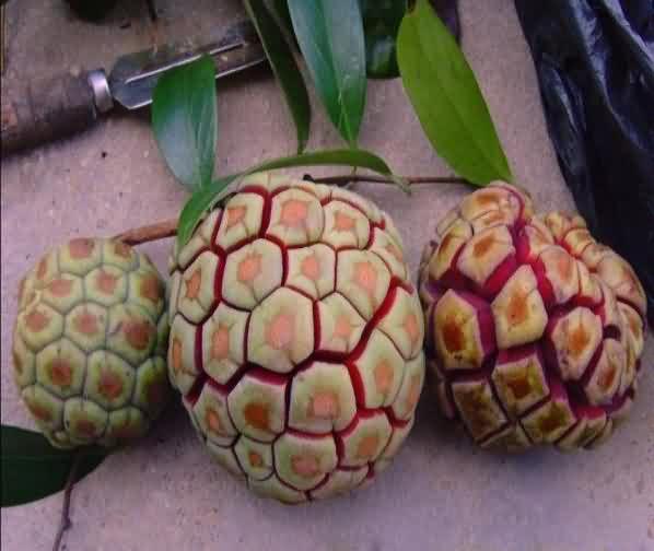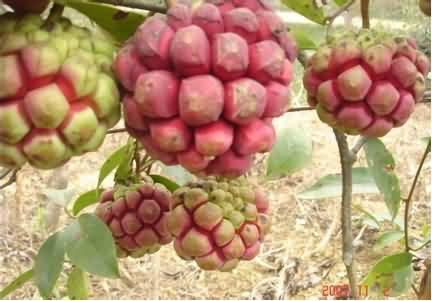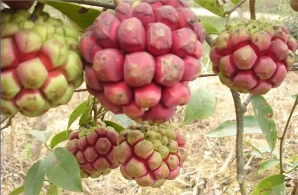 小漿果倒卵形,長達4厘米,外果皮革質,不顯出種子。種子心形或卵狀心形,長1-1.5厘米,寬0.8-1厘米。花期4-7月,果期7-11月。[2]果型為聚合果,表面恰似足球;形狀新穎,非常奇特。果大有光澤,表紋象菠蘿,垂吊如燈籠;果徑10~12厘米,果重600克左右,大果可達1200克;幼果青綠色,成熟為深紅,色艷如花,珍奇可愛,這一大自然的獨特造形令人嘆為觀止。作矮化盆栽,更是天然杰出的一幅藝術佳作。