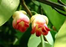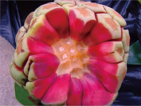 花單生于葉腋,稀成對,雌雄異株;雄花:花被片紅色,10-16片,中輪1片橢圓形,長2-2.5厘米,寬約14毫米,內輪3片明顯增厚,肉質;花托長圓錐形,長7-10毫米,頂端具1-20條分枝的鉆狀附屬體;雄蕊群橢圓體形或近球形,徑6-7毫米,具雄蕊14-48枚;花絲頂端為兩藥室包圍著,花梗長1-4厘米,雌花:花被片與雄花相似,花柱短鉆狀;頂端無盾狀柱頭冠,心皮長圓體形,50-80枚,花梗長5-10毫米。聚合果近球形,紅色或暗紫色,徑6-10厘米或更大;