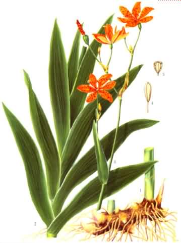 射干(學(xué)名:Belamcanda chinensis(L.)Redouté)為多年生草本。根狀莖為不規(guī)則的塊狀,斜伸,黃色或黃褐色;須根多數(shù),帶黃色。莖直立,莖高1~1.5米,實(shí)心。[1]